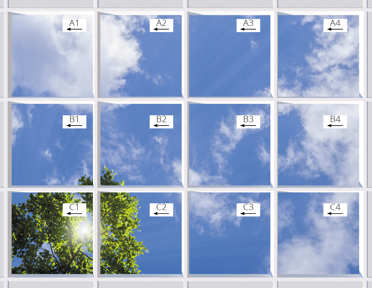 Wir empfehlen Handschuhe zu benutzen, damit Sie Fingerabdrücke oder Vermutzung der Bilderoberfläche vermeiden. Setzen Sie Ihre Deckenmotive vorsichtig und gemäß des Layouts in Ihre Decke ein. Orientieren Sie sich für die richtige Anordnung an beigefügtem Layout.